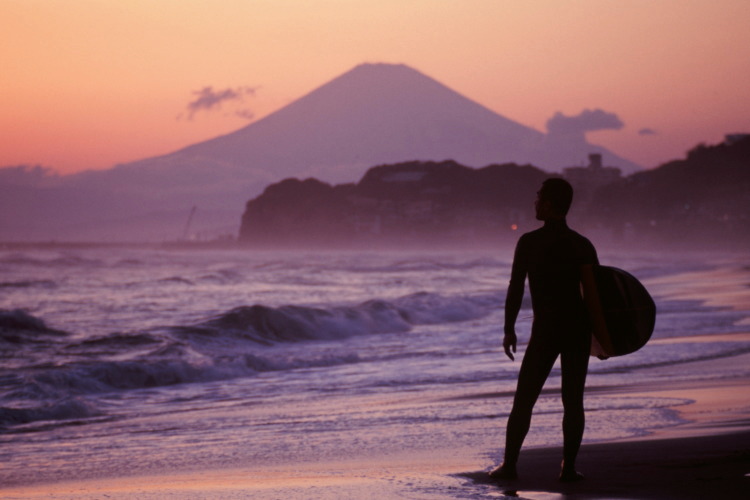 富士をバックに悠然と立つサーファー。これぞ湘南サーファー。思わずシャッターを切った(^^♪